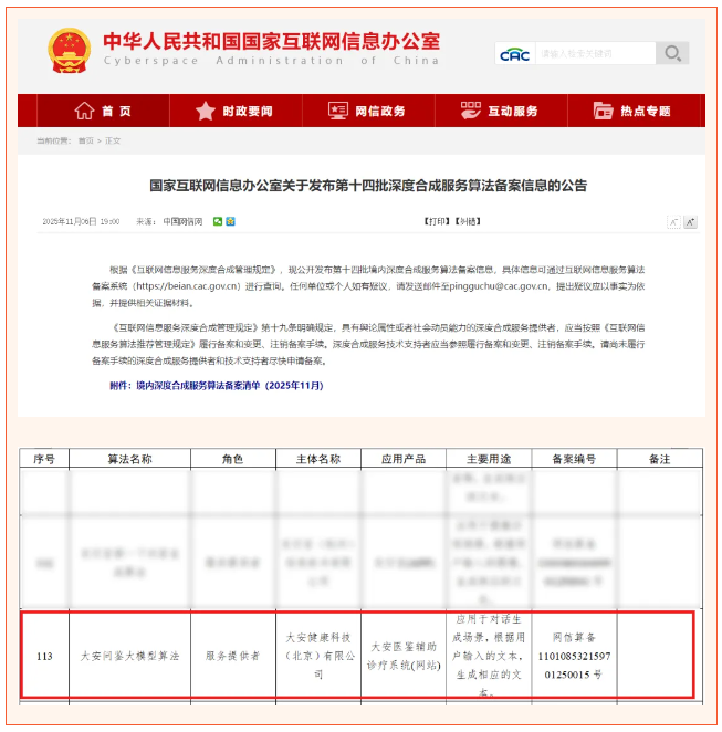 近日,国家互联网信息办公室正式发布第十四批深度合成服务算法备案清单,大安健康自主研发的“大安问鉴大模型算法”(备案编号:网信算备 110108532159701250015 号)成功入选,正式获得国家互联网信息服务算法备案,标志着该算法在合规性、安全性与专业性上得到国家级认可。