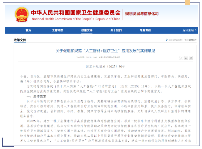 近日,国家卫生健康委员会等五部门联合发布《关于促进和规范“人工智能 +医疗卫生”应用发展的实施意见》(以下简称《意见》),为“AI + 医疗”领域发展划定清晰路径。《意见》不仅明确了核心发展目标,更从基层应用、临床诊疗、患者服务、中医药发展、公共卫生保障等八大关键方向,系统性部署了24项重点任务,为医疗卫生行业智能化转型提供了政策指引。